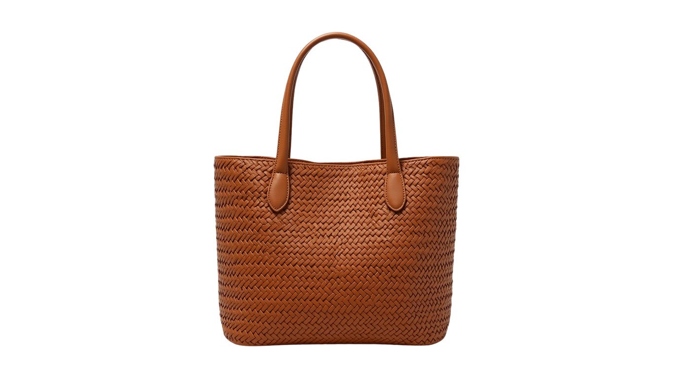 Mango’s Premium line quietly shifted to full-grain Italian leather in 2023, and this tote is the clearest proof of that. The braided handle is an overt nod to Bottega’s intrecciato without copying the weave it’s Mango’s own design, and it’s better for it. Drop the handles over one shoulder with a midi dress or straight-arm it for a sharper silhouette. Available in cognac and black cognac shows the grain best. Price hovers around $120.