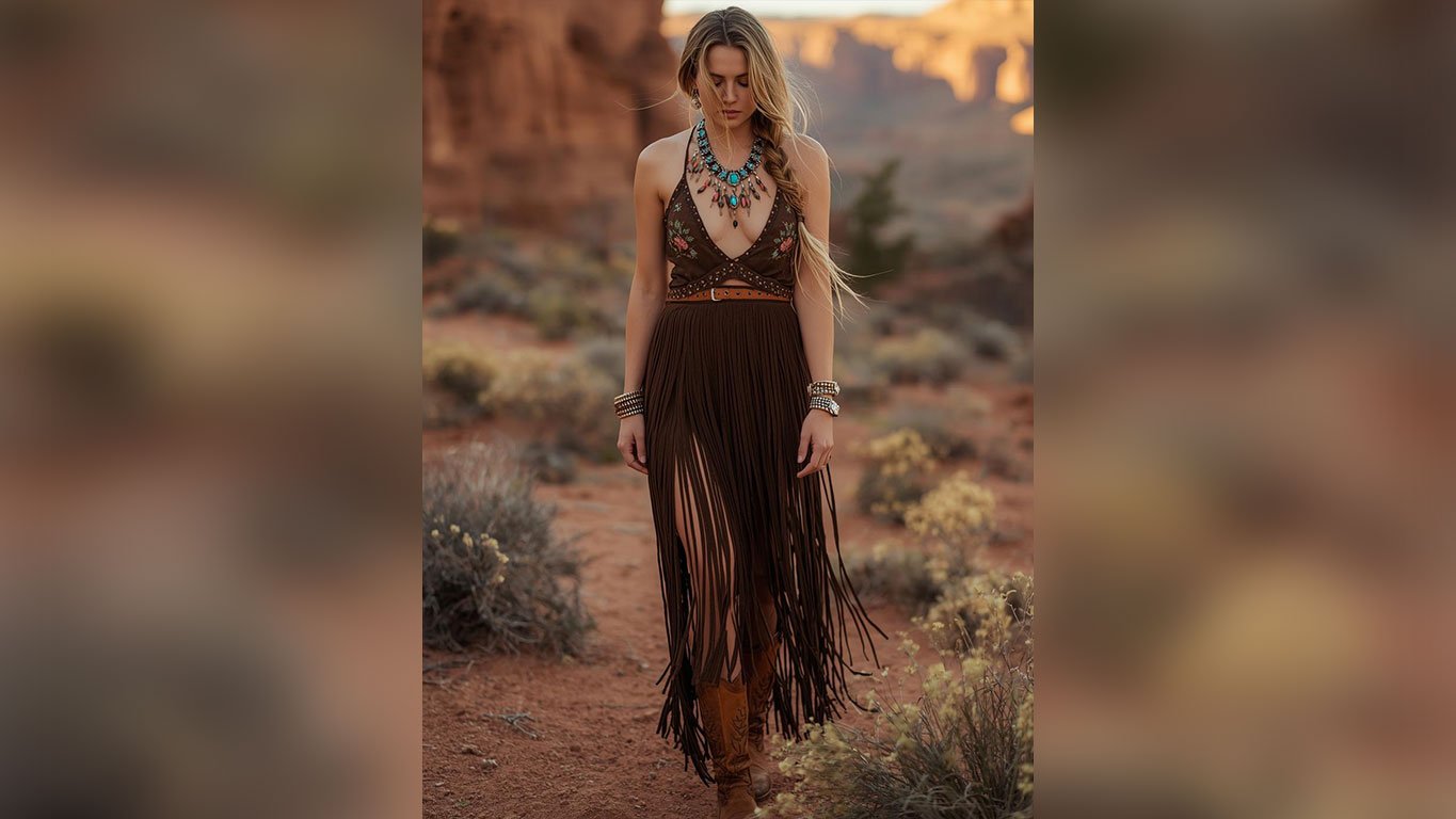 Brown suede fringe and tall embroidered cowgirl boots on red desert earth is a combination that owns its own lane in outdoor music festival style. This isn’t trend-chasing — it’s just really good boho dressing with real roots behind it.