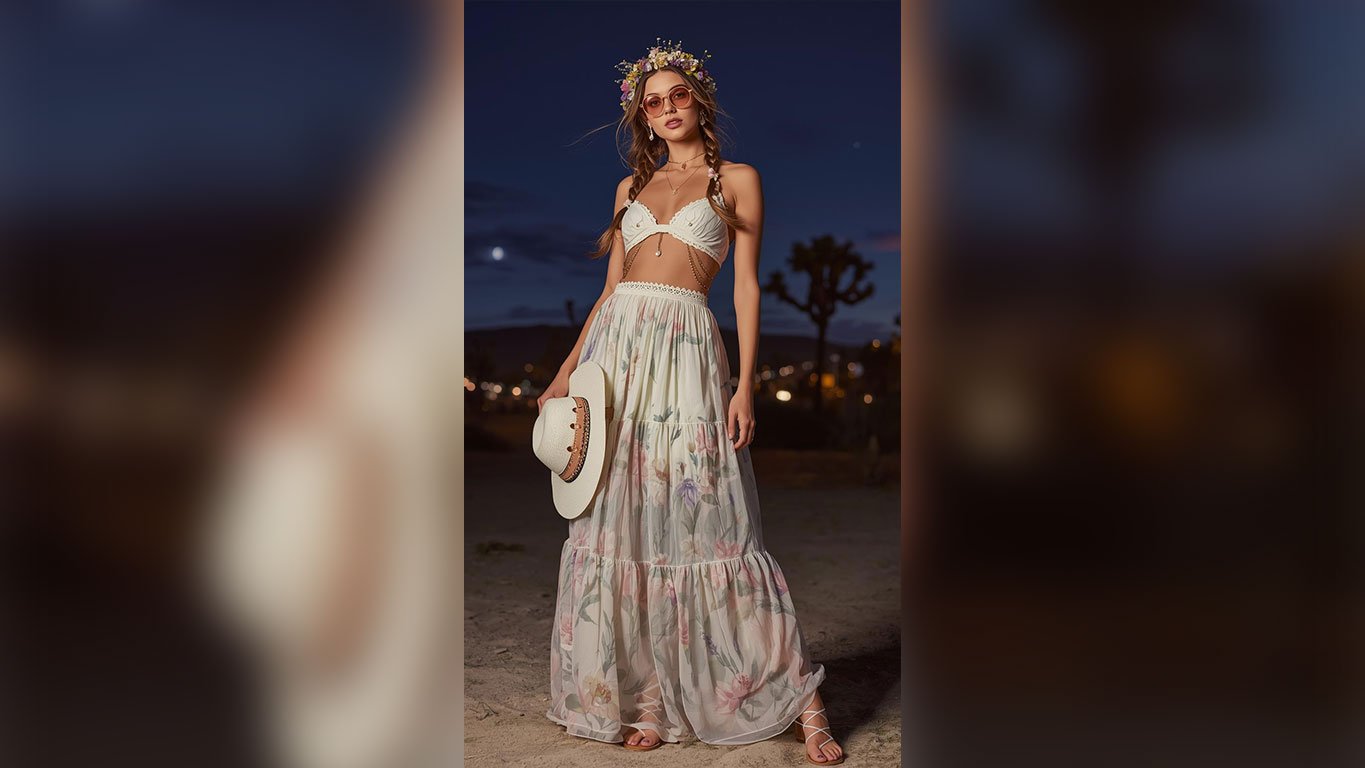 Pastel floral maxi skirts paired with crochet bralettes are having their biggest moment in desert festival fashion right now — and night sky Joshua tree backdrops are exactly where they belong. White strappy flat sandals on warm sand with soft festival lights glowing in the distance is genuinely the most magical way to end a Coachella night.