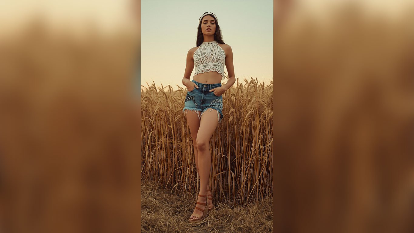 Crochet halter tops with high-waisted denim shorts have genuinely earned their place as a warm-weather festival staple because they’re easy to build on and even easier to wear all day. This golden wheat field backdrop makes the whole thing feel less like an outfit and more like a real moment.