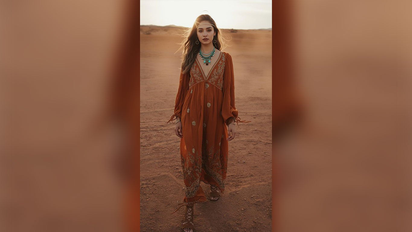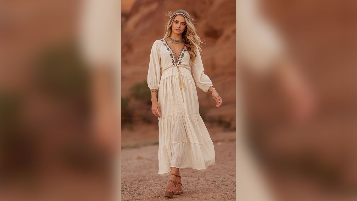 Embroidered maxi dresses with billowing sleeves have become one of the most searched warm-weather outfit silhouettes for good reason — they’re comfortable, camera-ready and carry serious cultural richness in every stitch. Lace-up gladiator sandals at the hem seal this desert style moment perfectly.