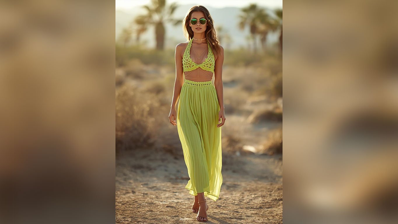 Neon lime crochet paired with a flowing pleated maxi skirt in California desert sunlight just hits differently. Bold color, easy silhouette — this is warm-weather confidence done right.