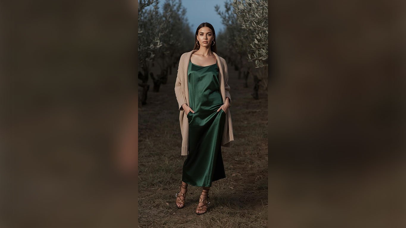 A deep emerald satin slip dress layered under an oversized cream knit cardigan is the kind of desert festival outfit nobody expects but everybody remembers. That rich green against the muted beige creates a color story that feels genuinely sophisticated without trying to be.