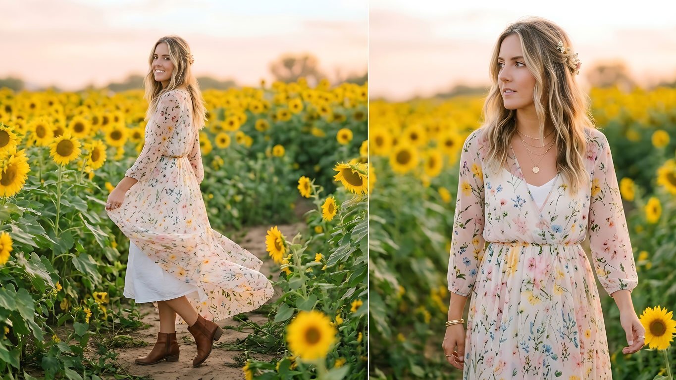 There’s something about a floral chiffon duster swaying through a sunflower field that just stops your scroll, and that’s exactly the energy driving summer 2026 fashion trends right now. Soft watercolor blooms, flowy layers over a simple white slip dress, and worn-in brown boots make this look feel deeply personal, not overdone. It’s romantic dressing at its most natural.